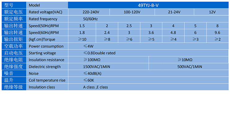 电机主要性能表 SPECIFICATION