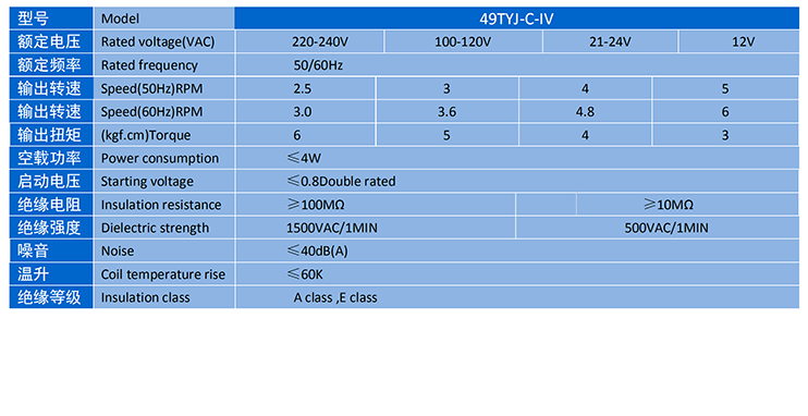 电机主要性能表 SPECIFICATION